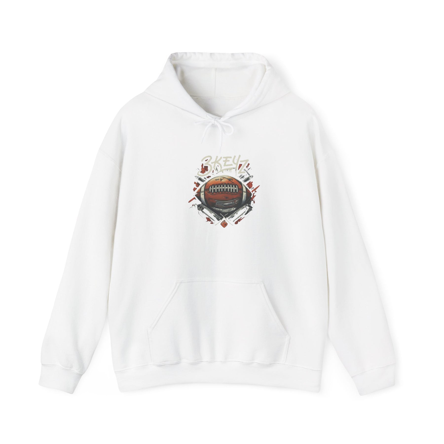 The 3keyz FootballStrong3 Drip Hoodie is a stylish and cozy addition to any wardrobe. With its classic fit, spacious kangaroo pouch pocket, and adjustable drawstring hood, this hoodie is perfect for staying warm and comfortable. Made from a blend of 50% cotton and 50% polyester, the fabric is strong and smooth, ideal for printing. This hoodie is relevant for football fans looking for a comfortable and stylish option to wear while supporting their favorite team. Perfect for casual wear, game days, and sports events.